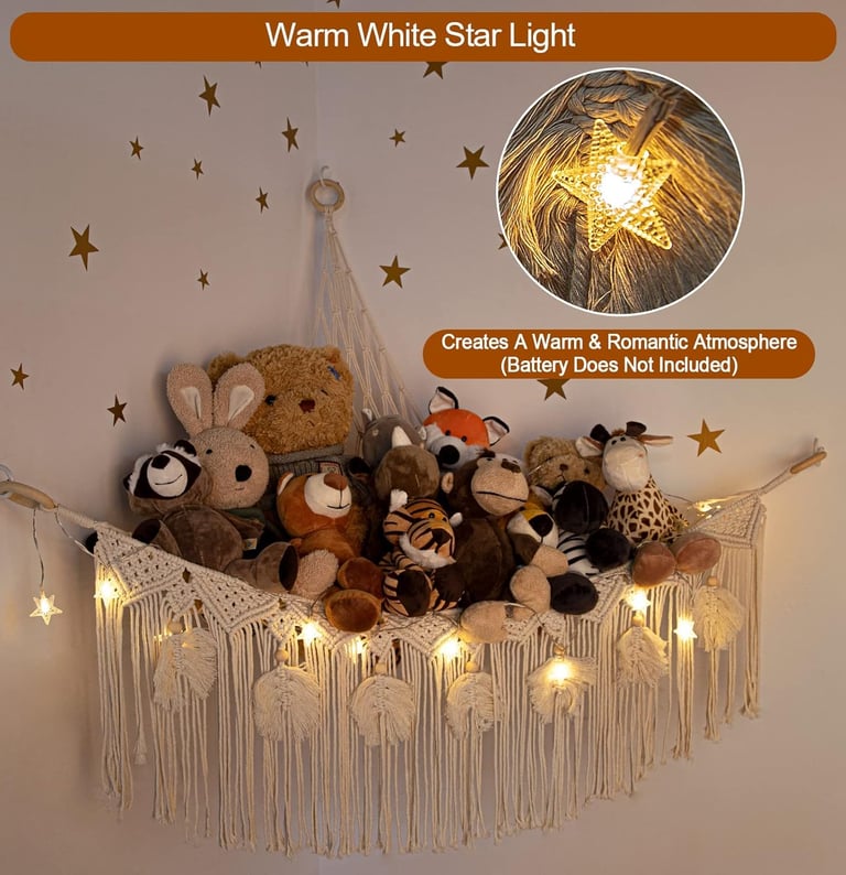 Macrame Plush Toy Hammock with Star Light – Boho Wall Storage for Nursery & Kids’ Room
